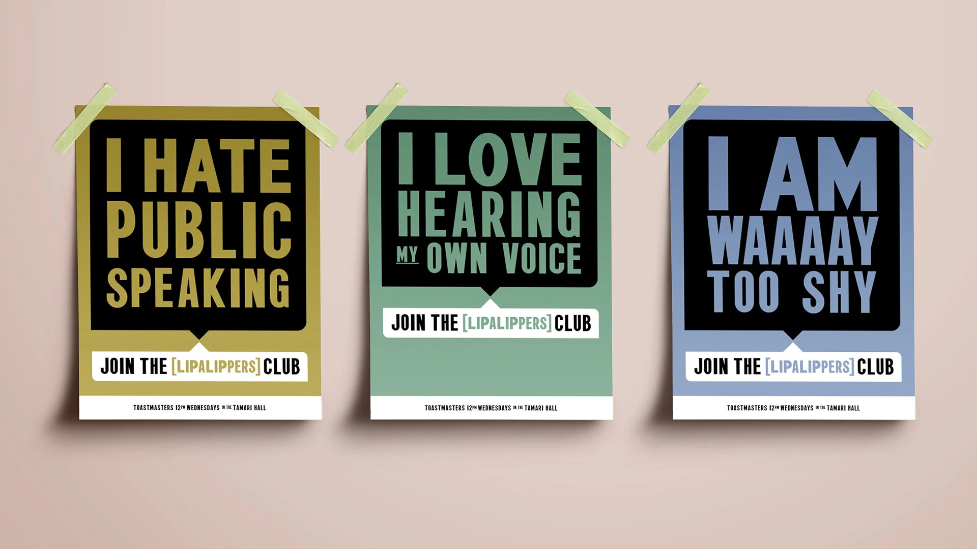 Campaign designed to recruit employees in an office building to join a weekly Toastmasters meeting during lunch hour. The LipaLippers Toastmasters club is for people and all their feelings towards public speaking.